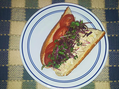 This tuna sub has sliced tomatoes plus hong vit and purple sango radish shoots. Order on your favorite bread.